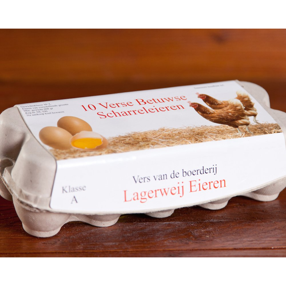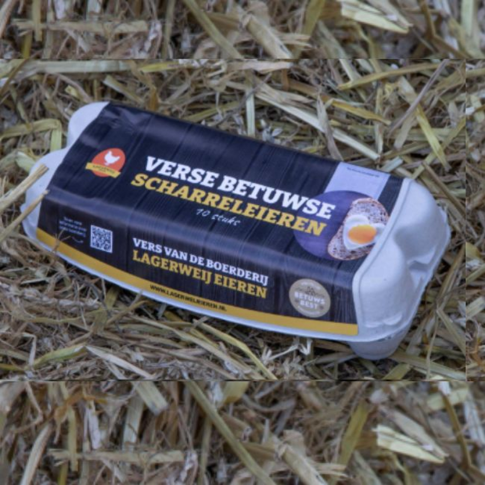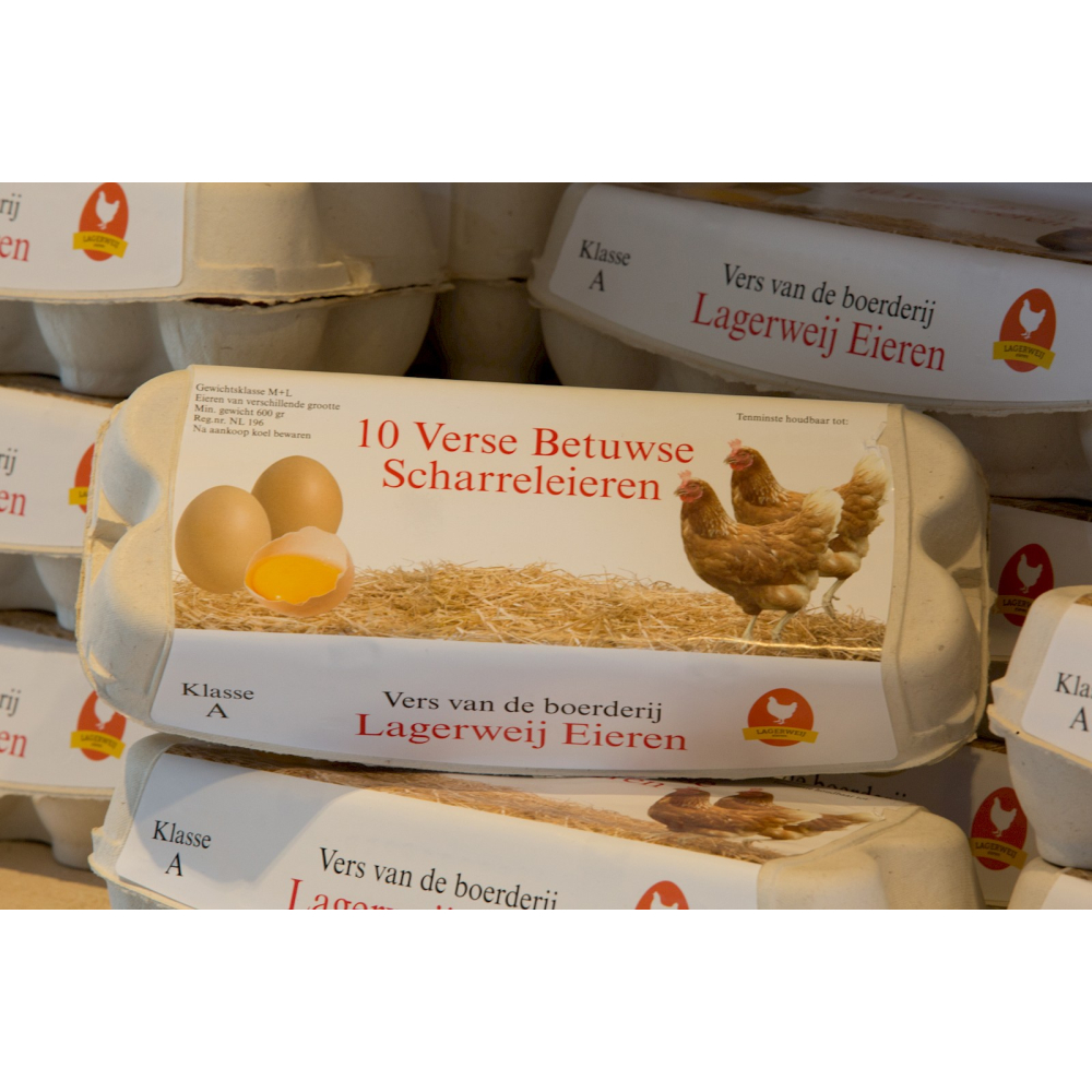 Onze eieren komen van de scharrelkippen van het pluimveebedrijs Lagerweij en voldoen aan het IKB keurmerk, dit betekent dat de weg die het ei aflegt van de kip tot de klant aan de strengste eisen voldoet. Daarnaast krijgen kippen van Lagerwei een eigengemaakte voersamenstelling met extra veel maïs en verantwoorde soja waardoor het ei nog lekkerder wordt!