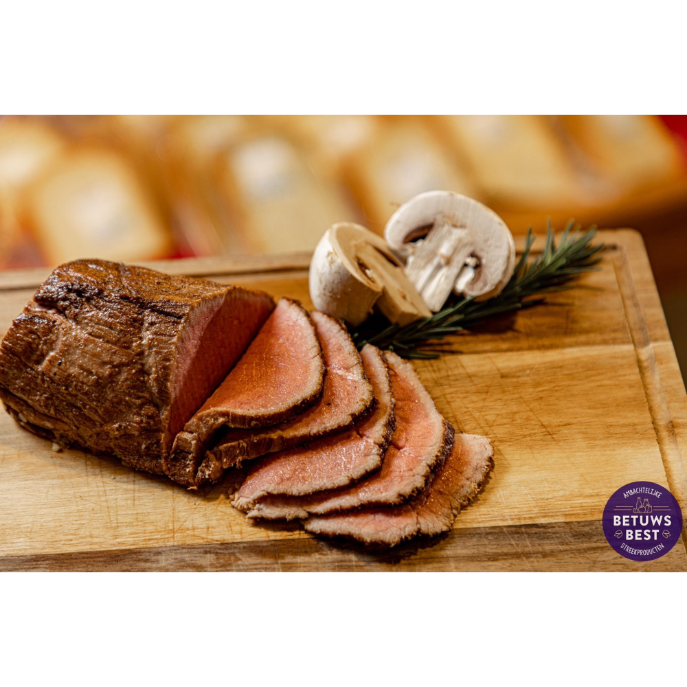 Dit rundvlees komt van onze eigen Belgisch wit-blauwe runderen, die kleinschalig worden gehouden op ons eigen land. Gedurende het voorjaar en de zomer lopen alle koeien en kalfjes vrij in de wei. 's Winters worden onze koeien gehuisvest in ruime strohokken en worden ze gevoerd met ruwvoer van eigen land. Bij ons weet je dus precies waar het vlees vandaan komt en ben je verzekerd van uitstekende kwaliteit en smaak.