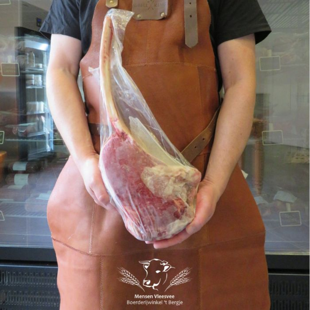 De tomahawk steak is een indrukwekkend stuk vlees dat de show steelt op elke tafel. Met zijn lange ribbeen en marmering is deze steak niet alleen een lust voor het oog, maar ook een ware smaakexplosie. Perfect voor de barbecue of grill, en een must-try voor iedere vleesliefhebbers.