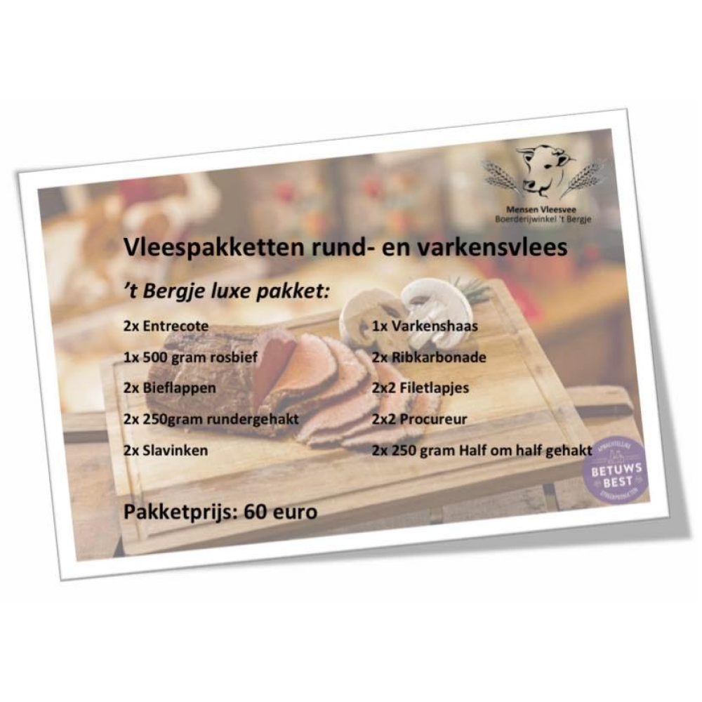 Combinatiepakketten van ons (h)eerlijke rundvlees in combinatie met het varkensvlees van de Grandia hoeve.